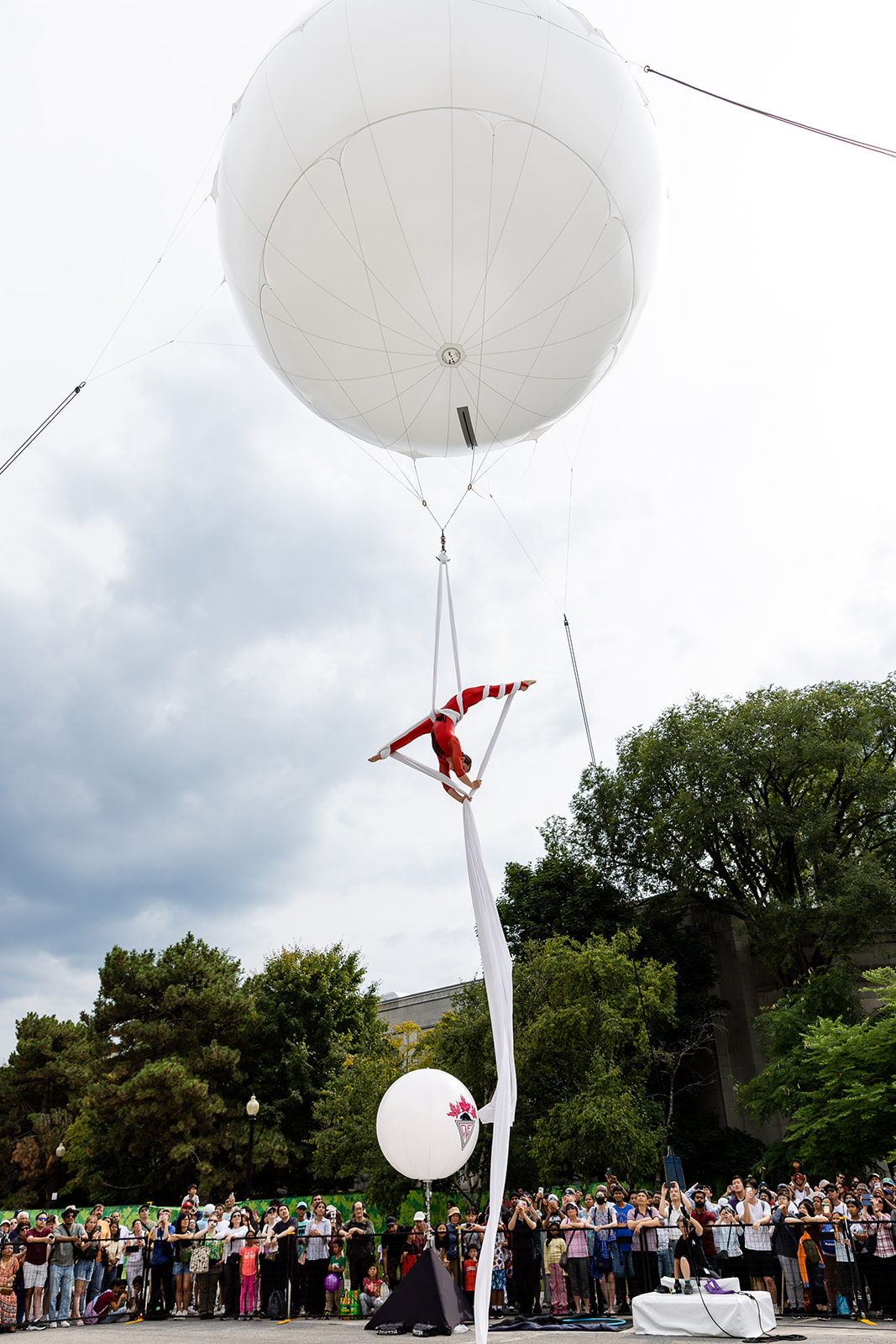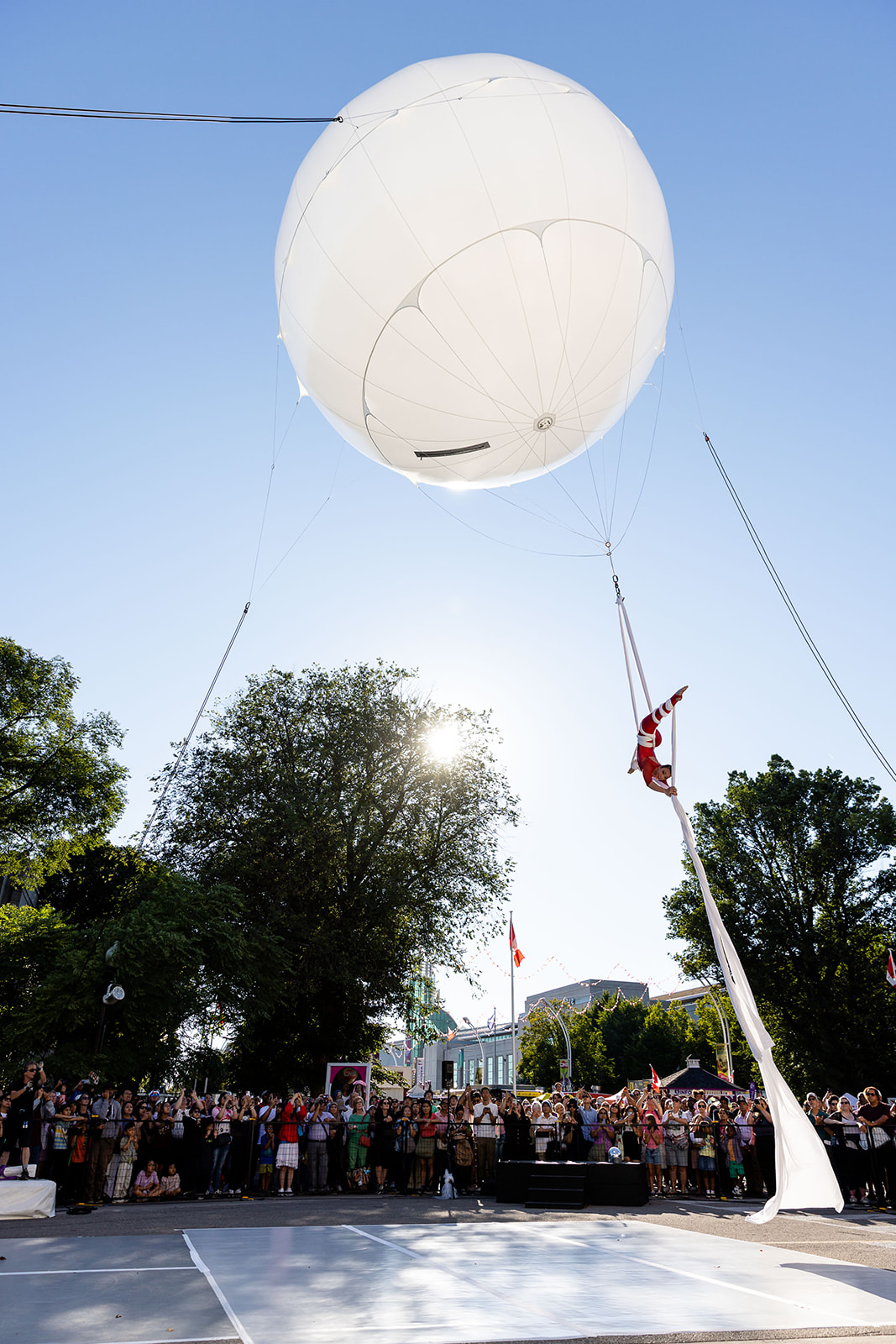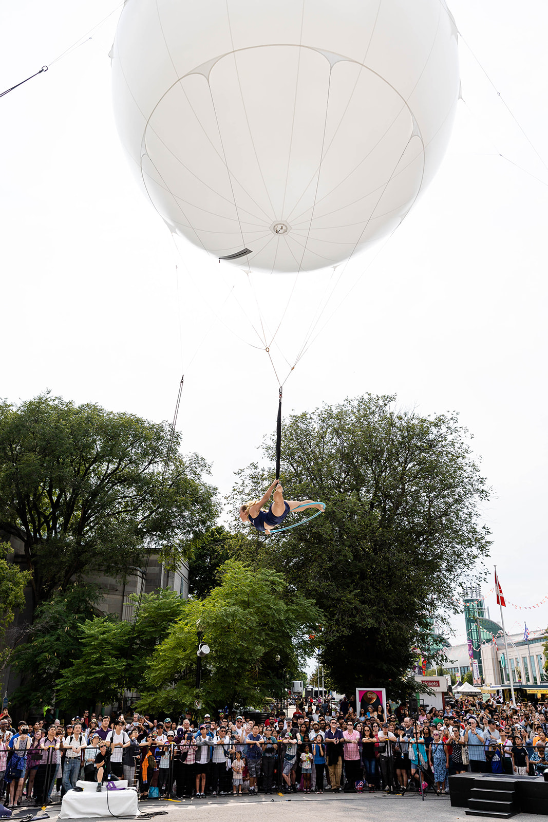 Introducing our state-of-the-art Aerial Balloon installation, the perfect attraction for corporate events and festivals. This innovative setup not only mesmerizes audiences with the breathtaking performance of an aerialist suspended beneath a giant balloon but also offers a unique way to showcase sponsor logos and branding. Imagine your event’s branding projected onto the balloon as the aerialist performs stunning acrobatics below, creating a visually captivating experience that will leave a lasting impression on your audience.